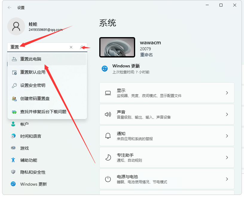 左上角搜索栏搜索 “重置”,并点击重置此电脑;